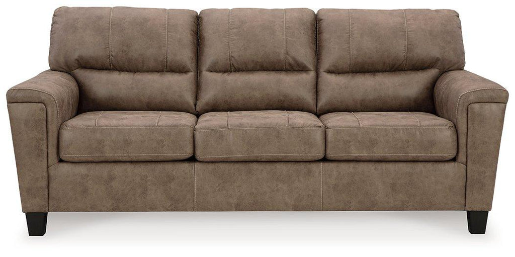 If you love the cool look of leather but long for the warm feel of fabric, you can take comfort in this queen sofa sleeper. Wrapped in a fabulous faux leather with a weathered hue and hint of pebbly texture to resemble the real deal, this decidedly modern sofa proves less is more. Elements include angled side profiling and track armrests wrapped with a layer of pillowy softness for that little something extra. Prominent jumbo stitching and clean-lined divided back styling lend fashion-forward flair. Rest assured, the queen memory foam mattress comfortably accommodates overnight guests.