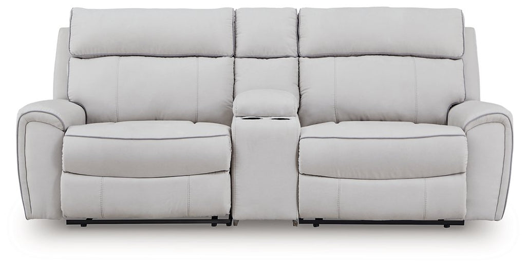 Smart, clean and ultra modern, this power reclining sectional is utterly in vogue. You'll love its indulgent cushions and contemporary bustle back styling. The sumptuous fabric, accentuated with contrasting welting, easily blends with your decor. A convenient console with storage and two cup holders keeps essentials handy. And with reclining at the press of a button, this modular sectional proves chic design and superb comfort go hand in hand.